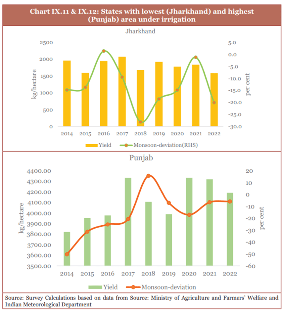 Climate change impacts rainfall and temperatures. Recently, the Economic Survey of India 2024-25 was released. The report indicates that there are a greater number of years with deficient rainfall in India and a greater number of intense short wet spells. Changes in rainfall patterns reduce the crop yield (production of crops in a certain piece of land such as kg per acre). In the states of Punjab, Haryana, Uttar Pradesh, and Telangana, more than 85% of the cropped area is irrigated, unlike Jharkhand and Assam where less than 20% of the cropped area is irrigated. Yield is less affected by monsoon deviation in the states with high irrigation coverage compared to the states with lesser irrigation coverage. Irrigation is one of the important shields to protect agriculture from climate change.